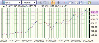 The gold price per troy ounce went from $37 in 1970 to $1,183 in 2010 (July 19th) so an increase of 3,097%!