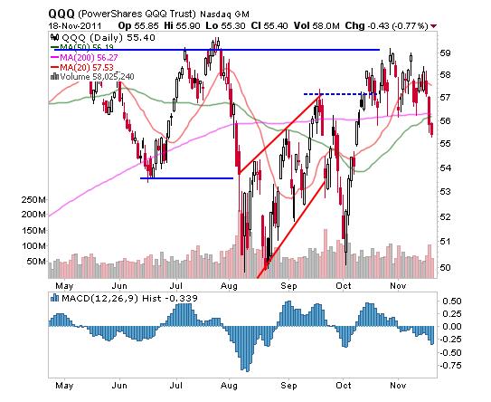 After holding above the $56 level for weeks, The Nasdaq 100, as represented the Powershares QQQ ETF (Nasdaq:QQQ) ETF, finally cracked this week. The move may be a little disconcerting for bulls, as QQQ is now acting as the weakest index, despite being the clear leader over the preceding few months. QQQ is now below prior support and its 50- and 200-day moving averages. There is some gap support and a prior low near $54 that may bring in buyers, but overall the action in QQQ doesn't bode well for market bulls.